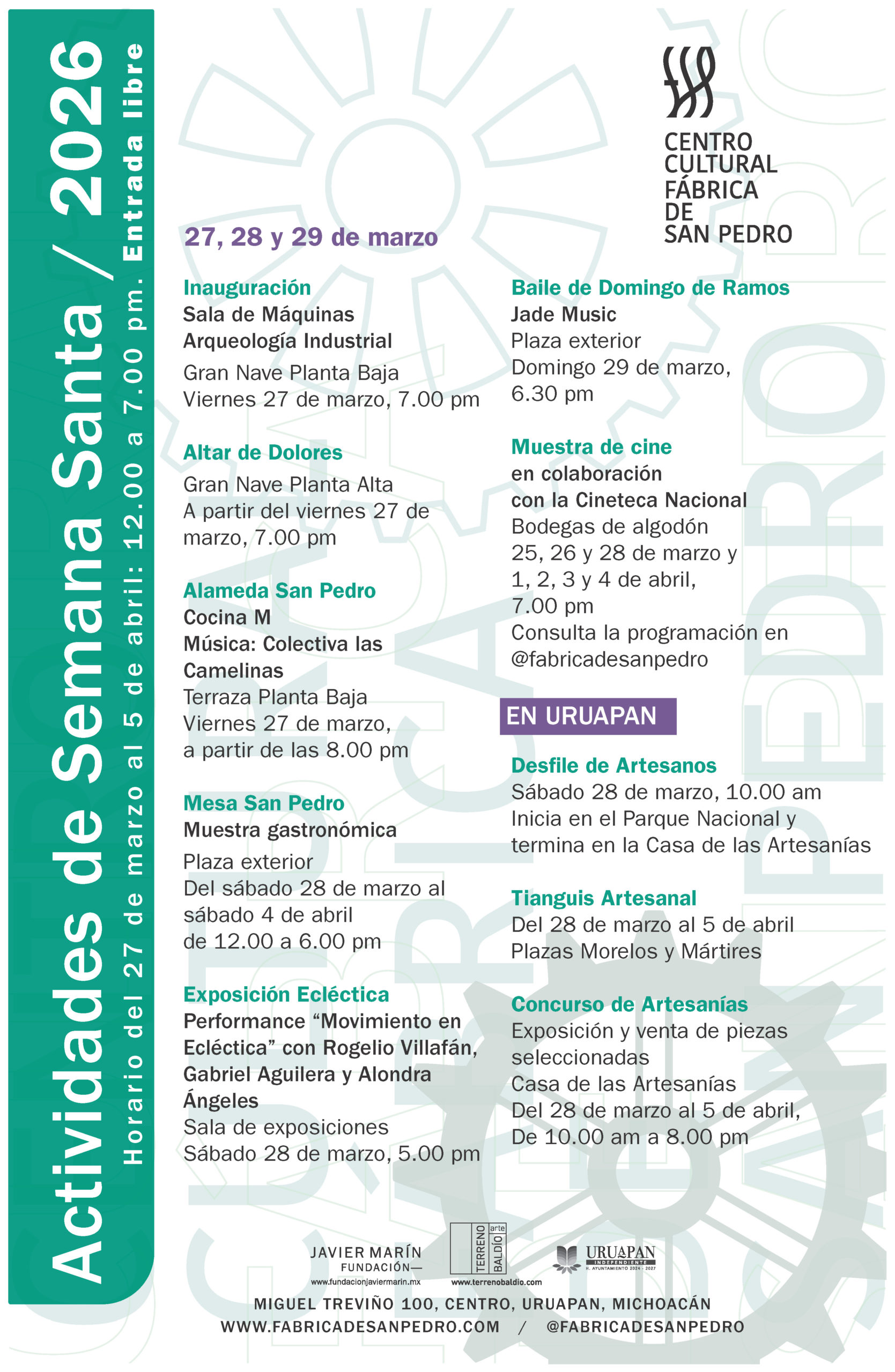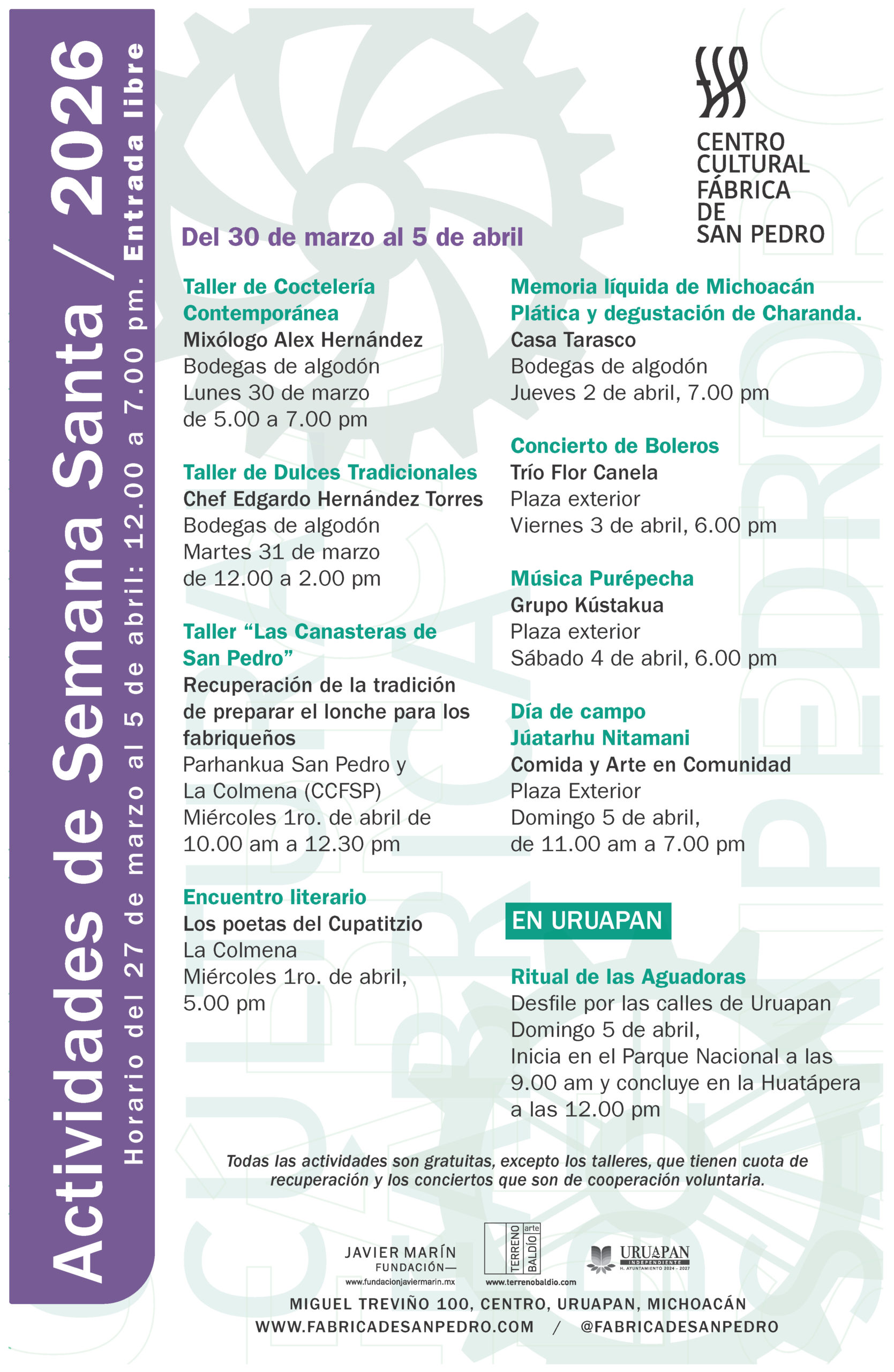 Michoacán es infinitamente rico en arte popular, cocina mexicana y diseño originario. A partir de la necesidad de fortalecer el tejido social y reforzar la identidad cultural, desde el año 2017, la Fundación Javier Marín, en conjunto con los Uruapenses, se dio a la labor de crear un Centro Cultural, en la emblemática Fábrica de Hilados y Tejidos de San Pedro en la ribera del río Cupatitzio. Los que estamos involucrados en este proyecto compartimos la convicción de este tipo de que proyectos puede detonar nuevas oportunidades de desarrollo social, cultural y turístico en la ciudad.